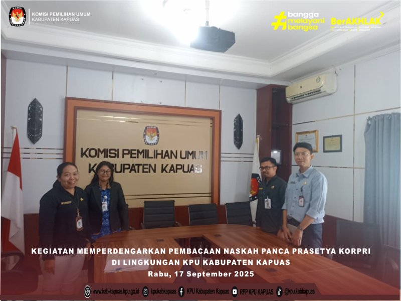 Rapat di pimpin oleh Plt. Ketua KPU Kabupaten Kapuas Charles Bronson, hadir Anggota KPU Kabupaten Kapuas Divisi Rendatin M. Fery Irawan, Divisi Hukum dan Pengawasan Deden Firmansyah, Divisi Sosdiklih Parmas dan SDM Dina Mariana, Divisi Teknis Penyelenggara Maya Widya Sari Sihombing, Sekretaris KPU Kabupaten Kapuas Heldayani, Kasubbag KUL Tanti Lupitae, Kasubbag Parhubmas dan SDM Gagah Christiantoro, mewakili staf Pelaksana Rendatin Akbar Rizkhan Khair Lutfi, Plt. Kasubbag Teknis dan Hukum Siti Nur Rahmayanti (17/9/2025).